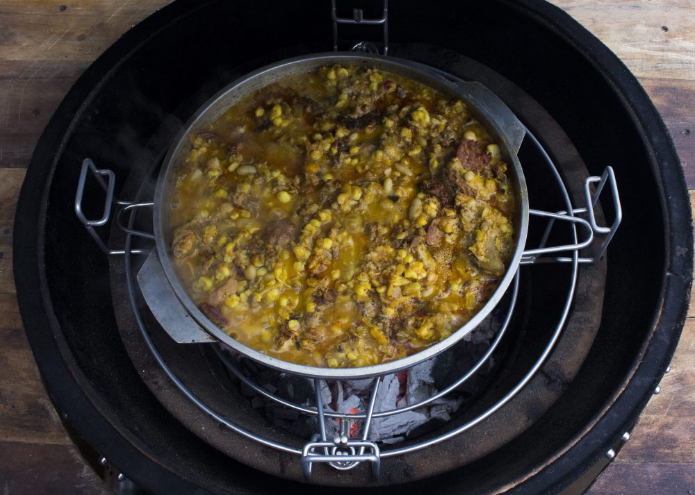 2- Ahora empezar a integrar el maíz y los porotos dejados en remojo con 8 horas de antelación (durante esas horas debe cambiarse el agua al menos tres veces). Agregar entonces los granos de maíz blanco y los porotos pallares, seguir cocinando y revolviendo por unos 5 minutos más.